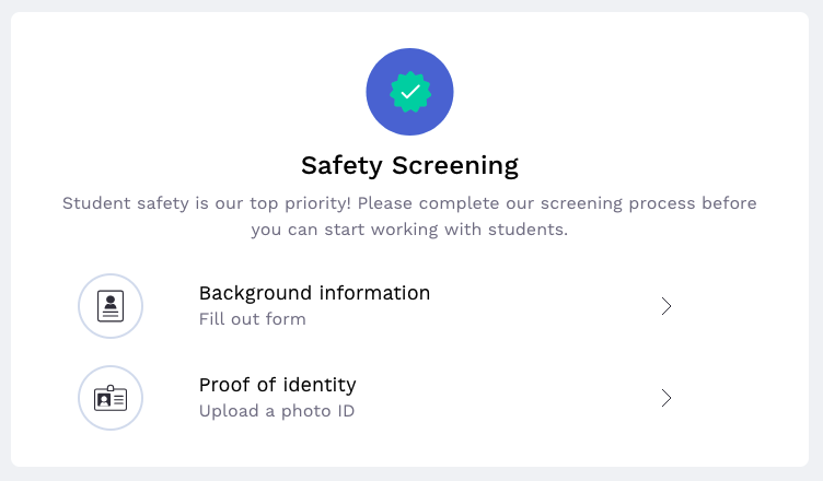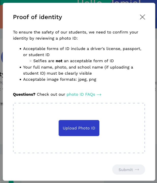 To ensure the safety of all students on our platform, you’ll need to submit a valid photo ID as proof of identity before you can tutor students on UPchieve.